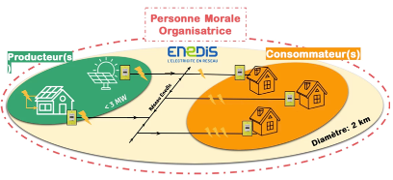 | Définition L’AutoconCommation Collective (ACC), c’est le fait de partager la production électrique d’un ou plusieurs producteurs entre plusieurs consommateurs, constitués en personne morale et répartis sur une zone géographique limitée définie par un arrêté. La production « circule » sur le réseau public de distribution. Le principe général Souvent le Producteur est l’investisseur qui va en priorité AutoConsommer pour lui avant d’injecter le surplus sur le réseau afin d’en faire profiter d’autres Consommateurs à un coût inférieur à celui du marché. La zone géographique Par défaut, un rayon maximum de 2 km entre le producteur et un consommateur. Par dérogation: en zone périurbaine rayon de 10 km en zone rurale rayon de 20 km Délai de la demande de dérogation : 6-9 mois (auprès du ministère chargé de l’énergie) |